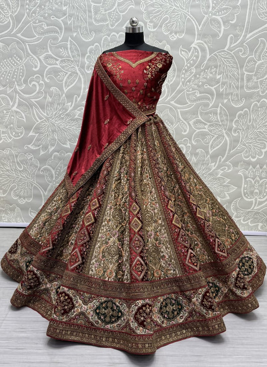 Alternate Red Velvet Kali work and Fancy embroidered Lehenga choli with double dupatta