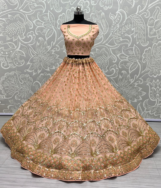 Fancy Embroidery of sequins and Zari Net Chickoo Lehengacholi