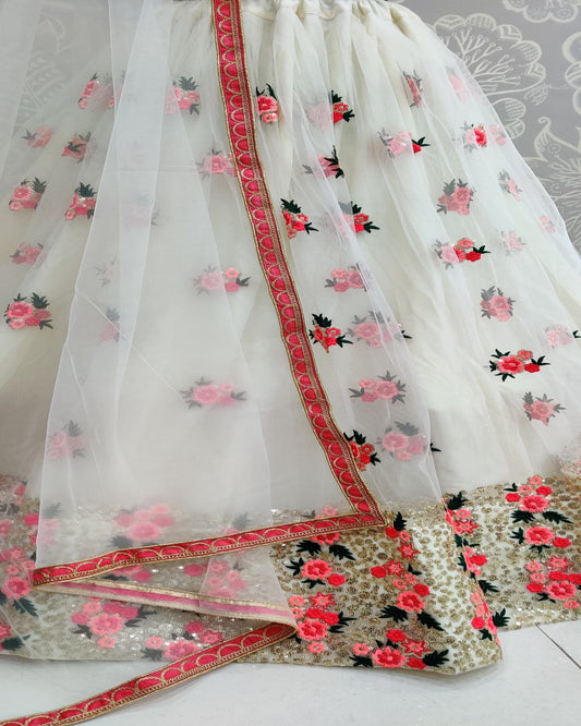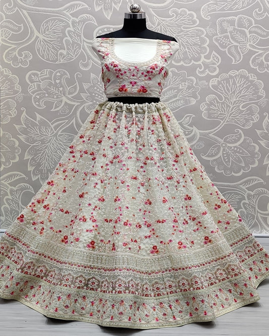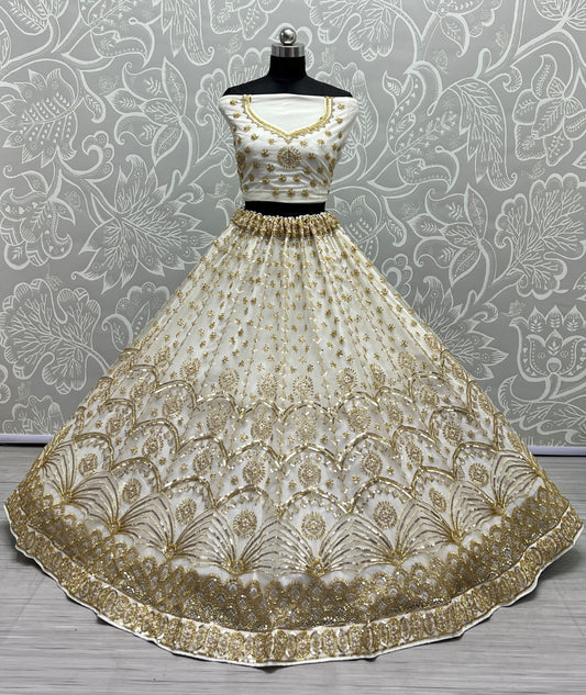 Revealing Thread Embroidery and Sequence Touch Designer Lehengacholi In White