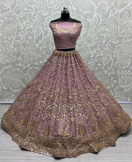 Fancy Embroidery of sequins and Zari Net Partywear Lavender Lehengacholi