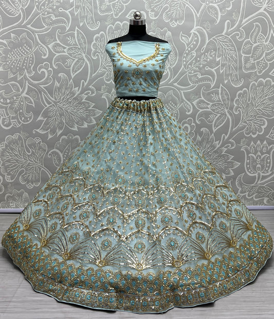 Khatali Work Designer Hand Val and Sequence embedded with Multi Thread Lehengacholi Sky