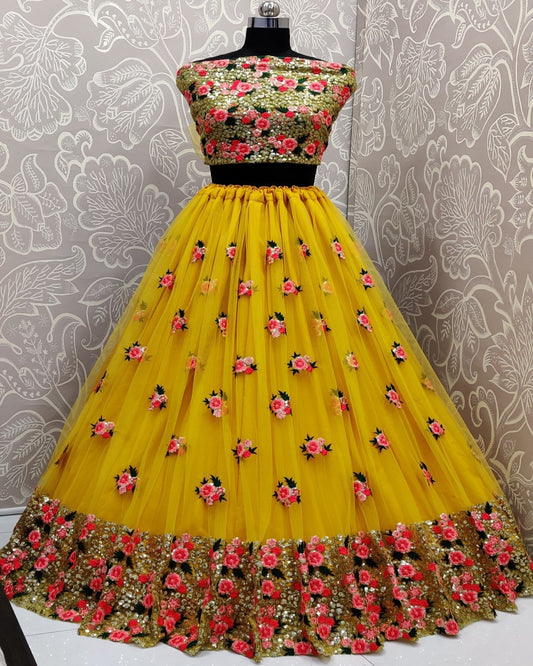 Meticulously prepared Hand mirror crafted Designer Bridal Lehengacholi in Mustard