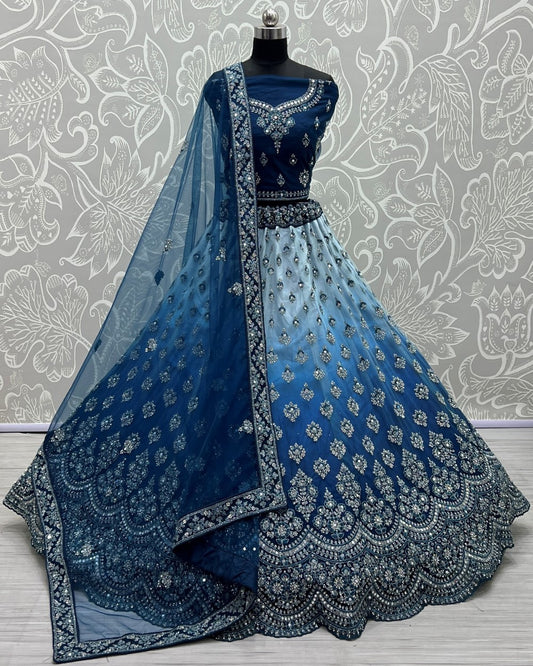 Mirror work in Shaded color Blue Lehenga choli for weeding