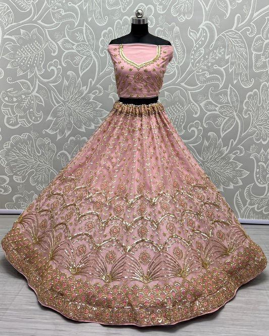 Sequence and patterned thread embroidery Designer Peach Lehengacholi