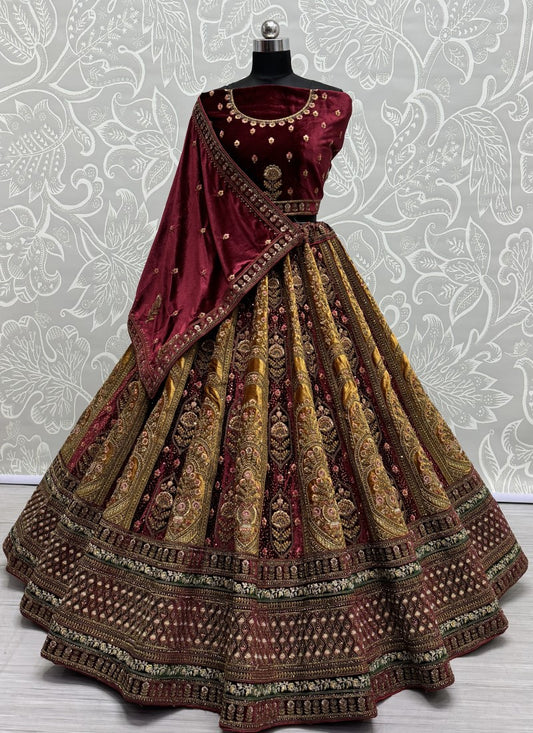 Sober Dori and Thread work combine velvet designer Lehengacholi in Mustard Colour