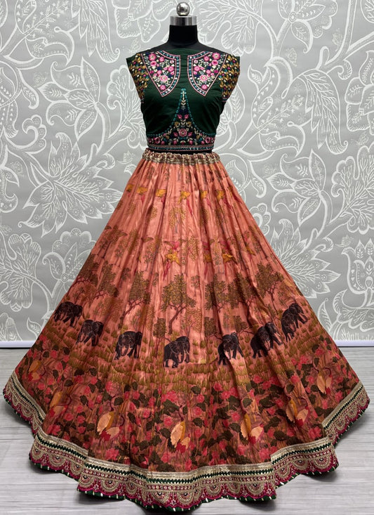 Exquisite look couture patterned partywear with beautiful dupatta Lehengacholi in Peach