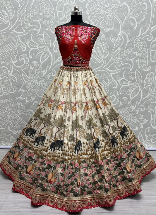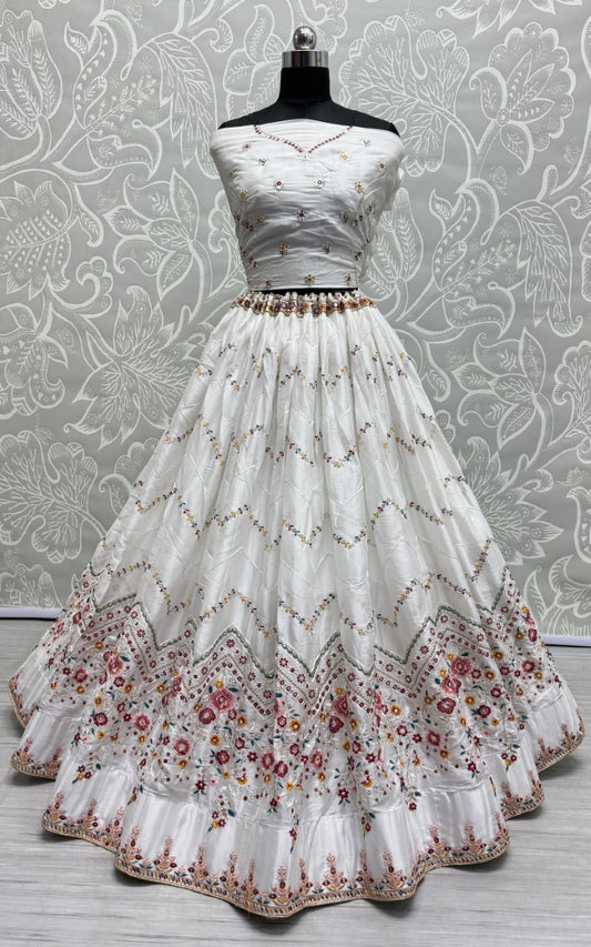 Exclusive Print and Beautiful sober Embroidered Lacework Lehengacholi with Pure Bandhani Dupatta White