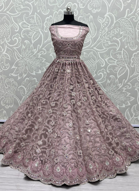 Handwork Look Inspired Embroidered Net Partywear Lehengacholi in Pink