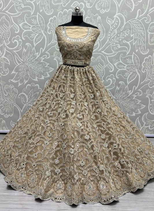 Heavy Bridal Net Embroidered Zircon diamond work Designer Beige Lehengacholi
