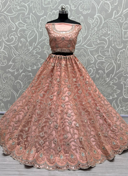 Heavy Bridal Net Embroidered Zircon diamond work Designer Peach Lehengacholi