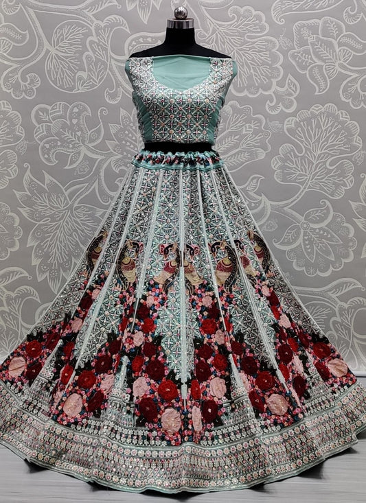 Attractive four sequins Embroidered Partywear Lehengacholi in Aqua