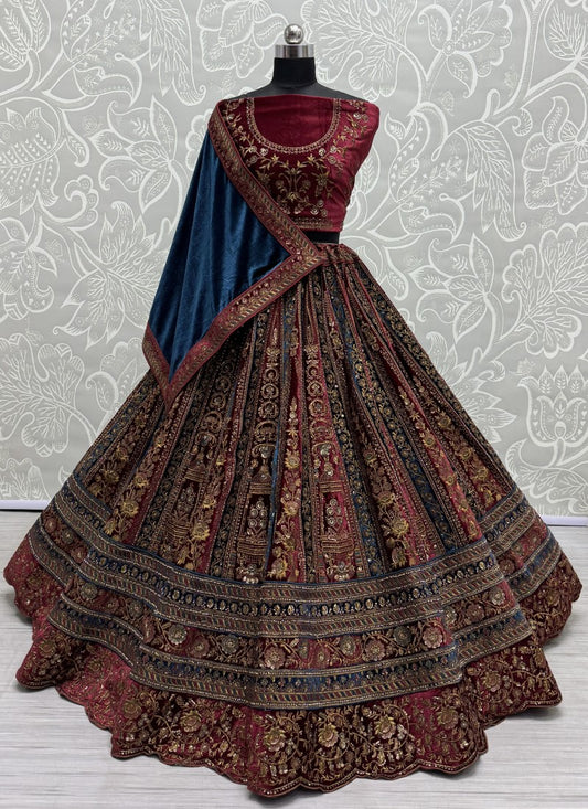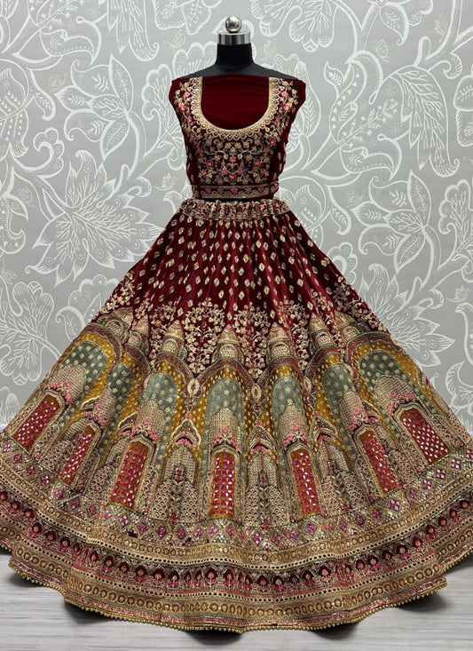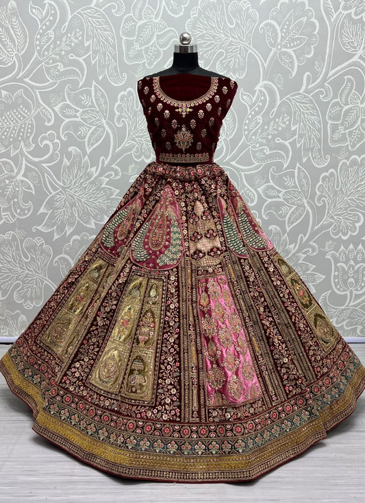 Heavy Embroidered and Multi color velvet Kali patch combine beautiful Lehengacholi in Maroon