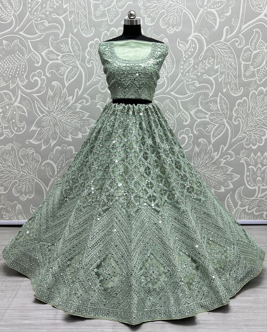 Heavy embroidery with mirror work designer Pista Lehengacholi