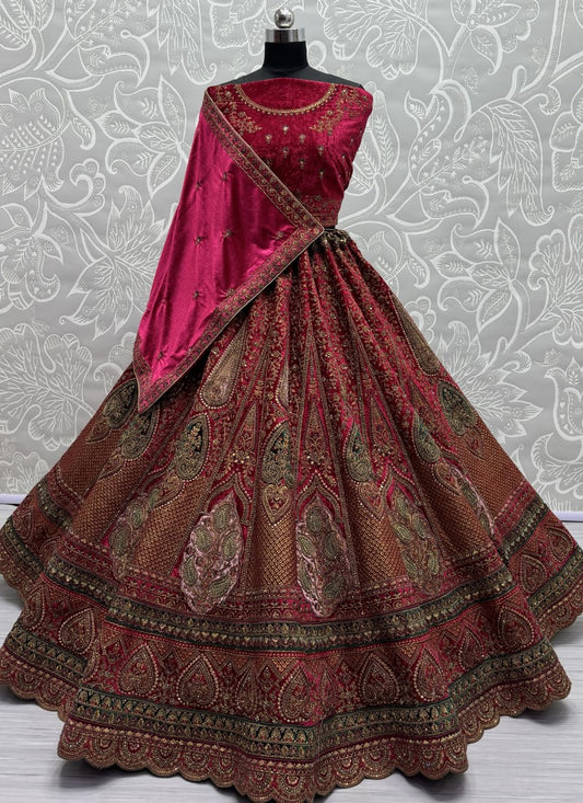 Perfectly Embroidered Velvet Patch work combine bridal Rani Lehengacholi with double dupatta