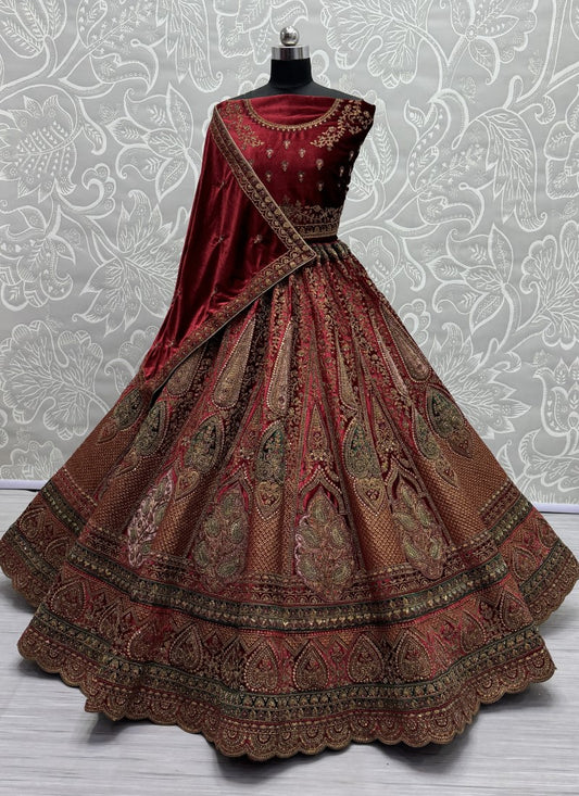 Perfectly Embroidered Velvet Patch work combine bridal Maroon Lehengacholi with double dupatta
