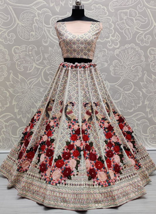 Beautifully Peacock Pattern Embroidered Partywear Cream Lehengacholi in lightweight