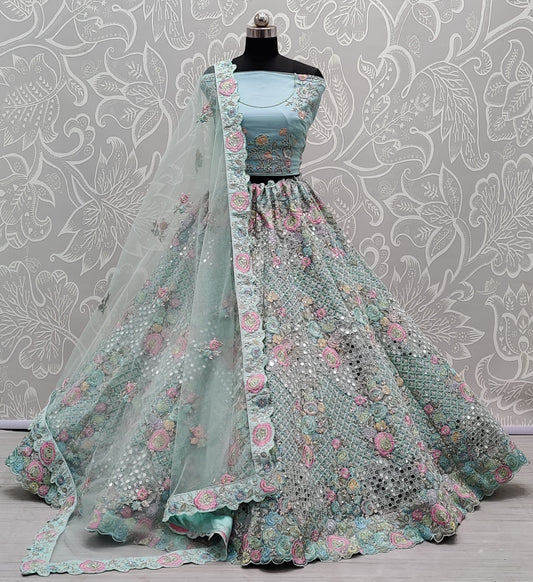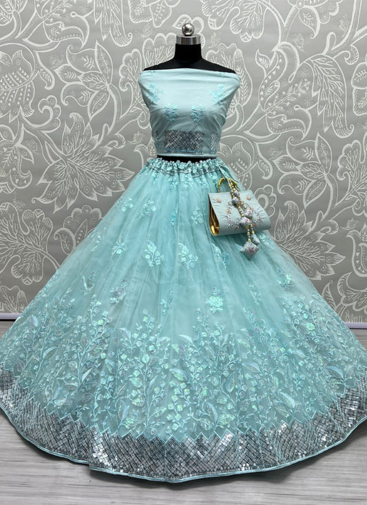 Real mirror and Multi sequins work Bollywood Style Sea Blue Lehengacholi