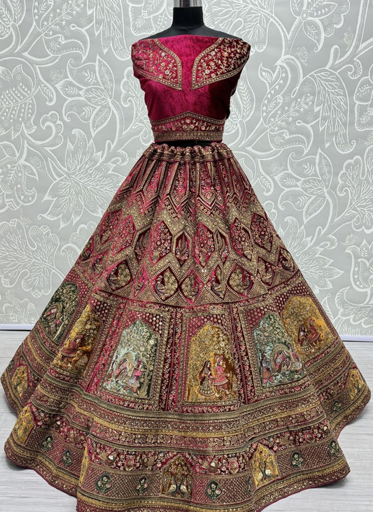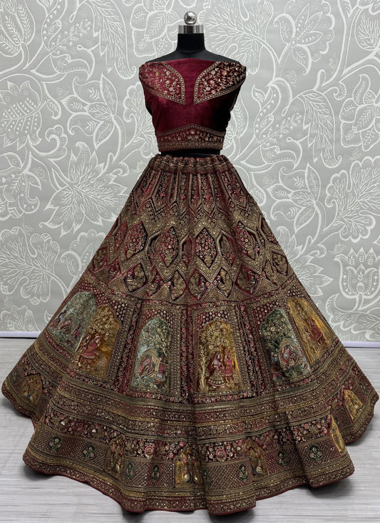 Various pattern embroidered designer velvet Lehengacholi in maroon colour