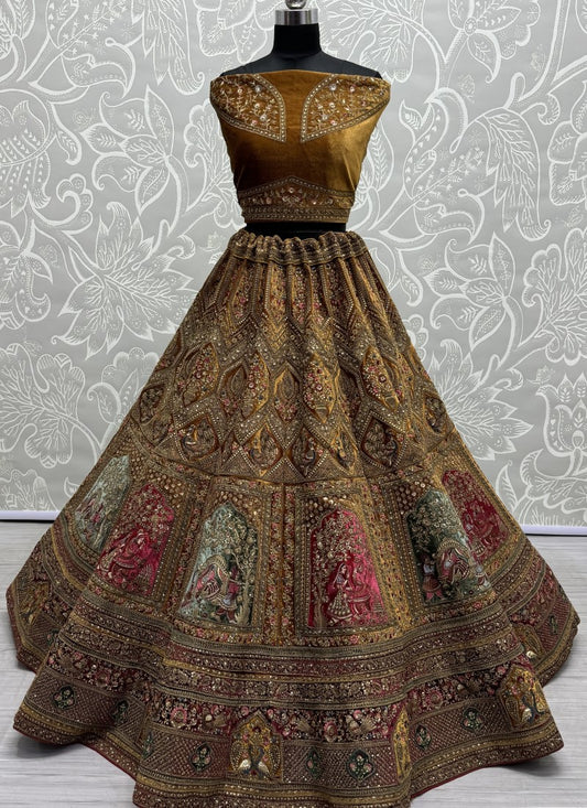 Various pattern embroidered designer velvet Lehengacholi in badami colour