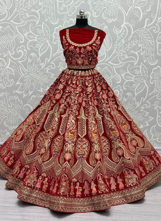 Very well crafted embroidery of peacock and Baarat designed bridal Red Lehengacholi