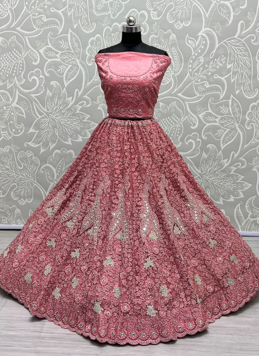 Very Well Detailed Embroidery Partywear Pink Lehengacholi