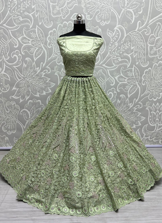 Zircon Diamond studded With Handwork Mirror attached Designer Party wear Pista Lehengacholi