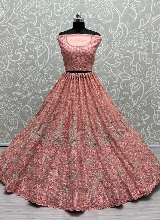 Very Well Detailed Embroidery Partywear Peach Lehengacholi