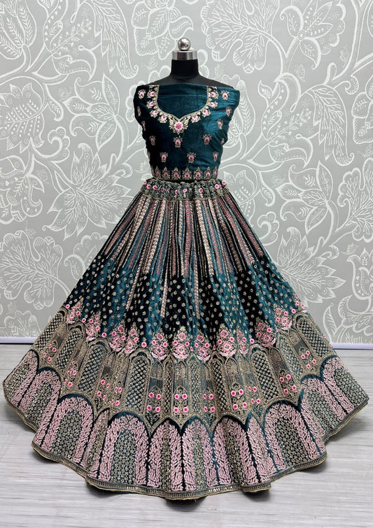 Dark Range in Velvet Embroidered with full of Zircon Diamond studded Lehenga choli Teal
