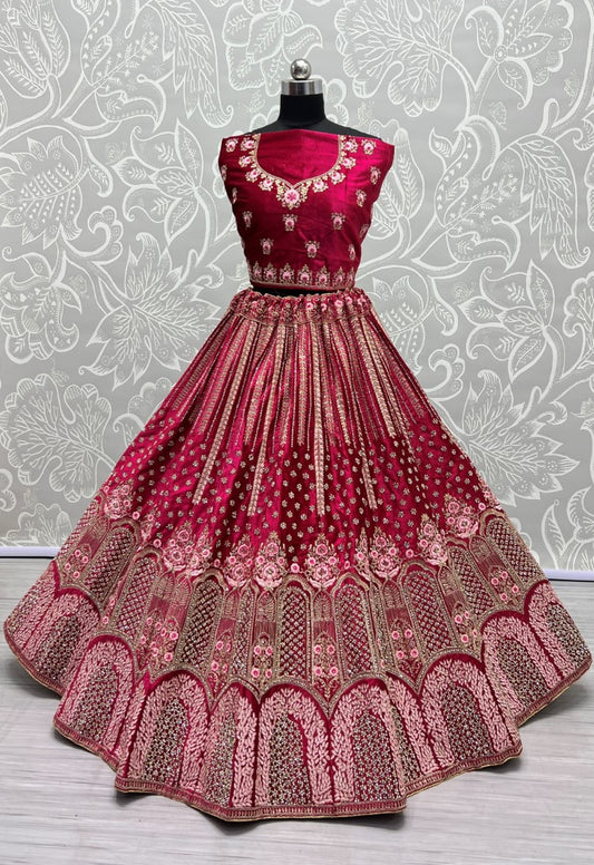 Designed Embroidered Patch and Multi thread work Lehengacholi in Raspberry