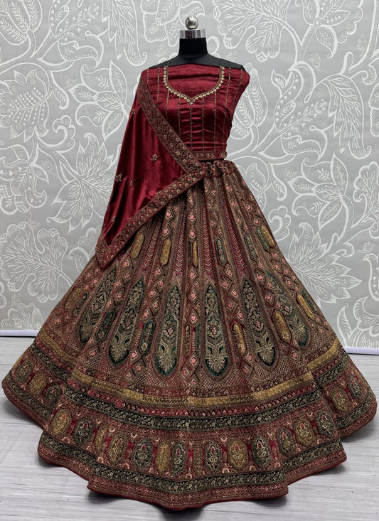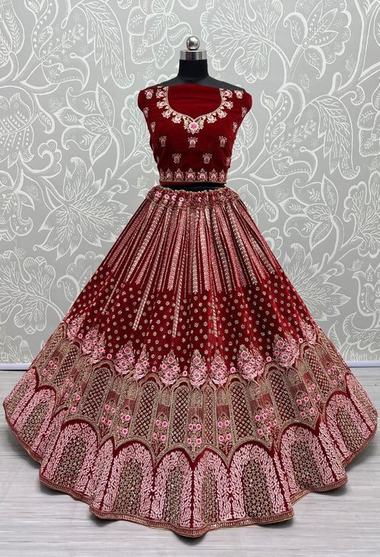 Dark Range in Velvet Embroidered with full of Zircon Diamond studded Lehenga choli Red