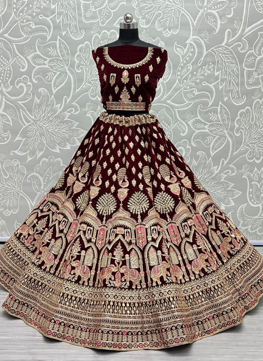 Designer Gajraj Embroidered Maroon Velvet Lehengacholi