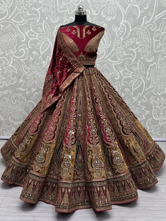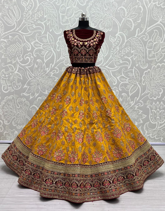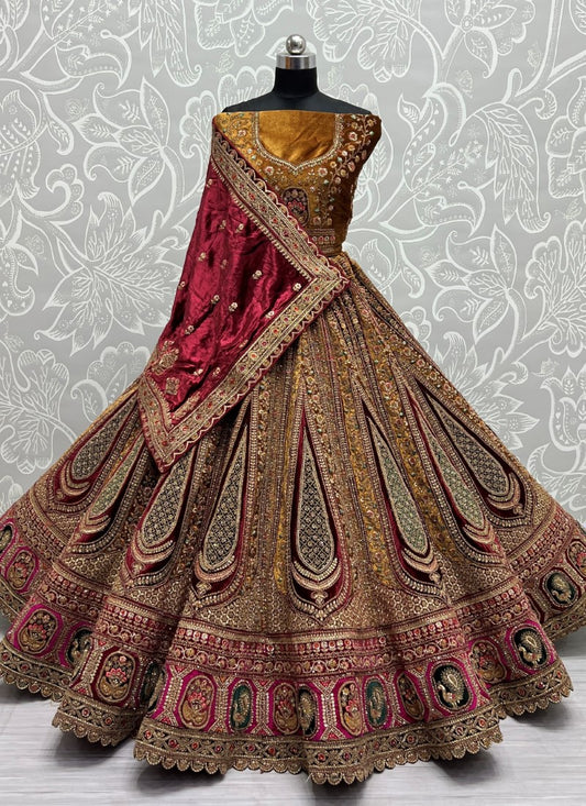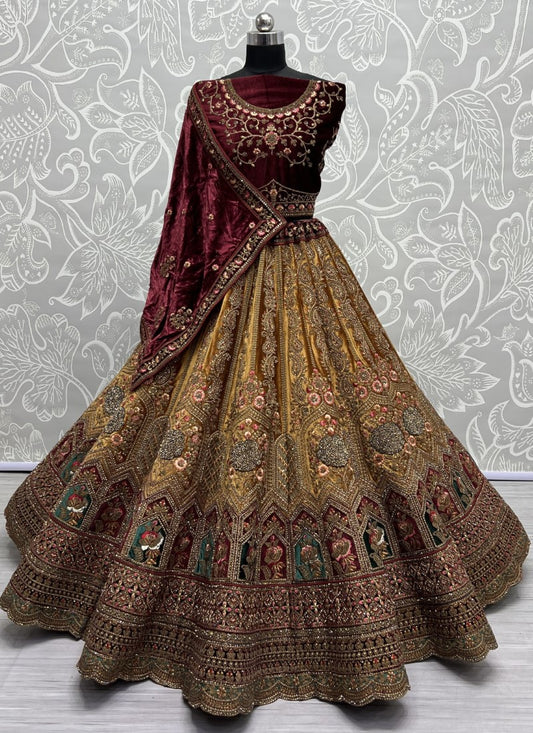 Mustard Colour designer bridal Lehengacholi combine with double colour velvet
