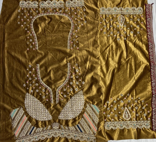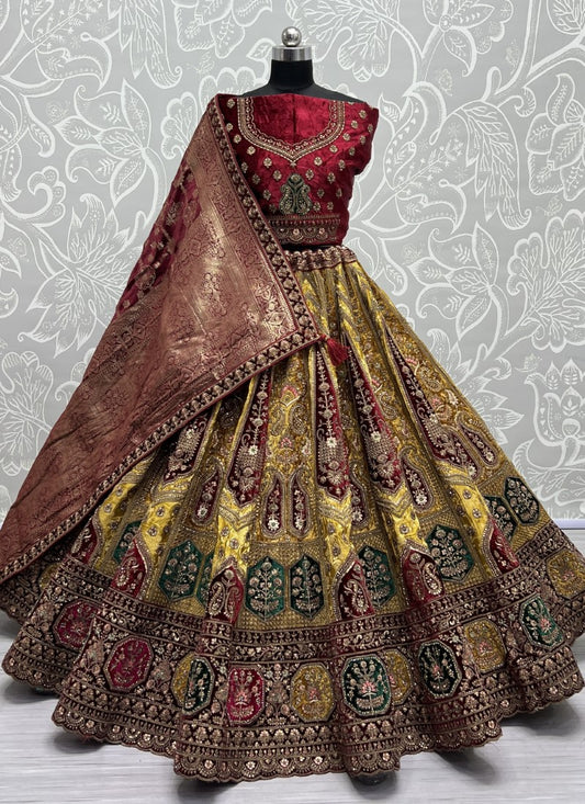Designer Heavy Dori Embroidery with Beautiful crafted Velvet Work Patch work Bridal Mustard Lehengacholi