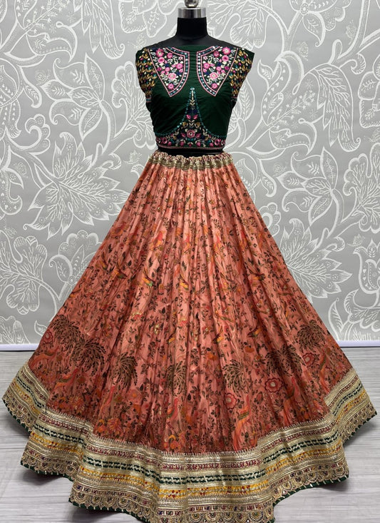 Meena Silk Carfted Printed Lehenga with Pure Bandhani Dupatta style partywear Lehengacholi Peach