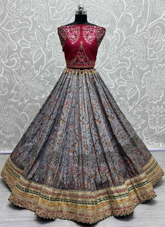 Meena Silk Carfted Printed Lehenga with Pure Bandhani Dupatta style partywear Lehengacholi Grey