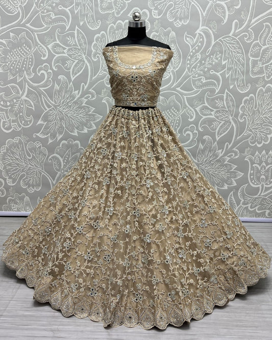 Designer Dori Embroidered Work Beige Partywear Lehengacholi