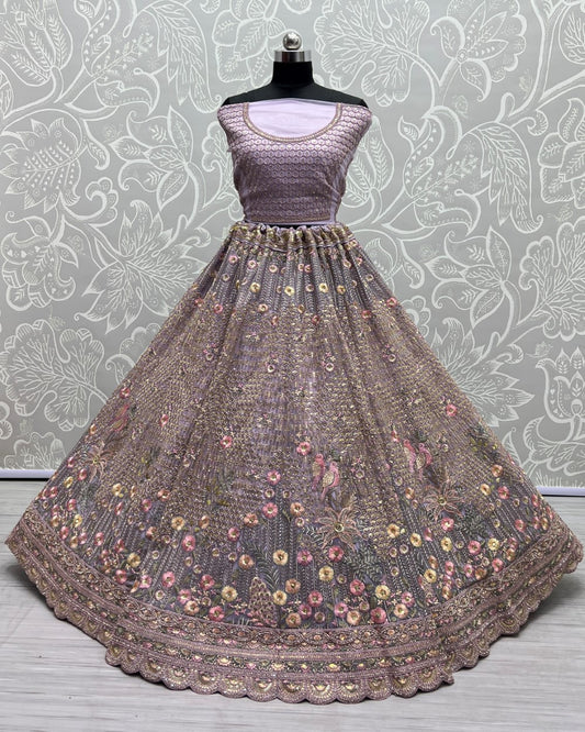 Fancy Embroidery of sequins and Zari Net Partywear Lavender Lehengacholi