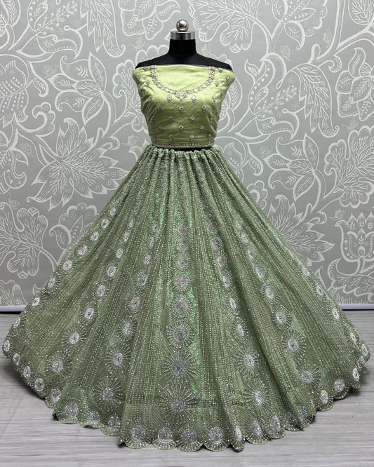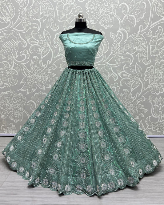 Full of zircon and sequins embroidered partywear Pista Lehengacholi