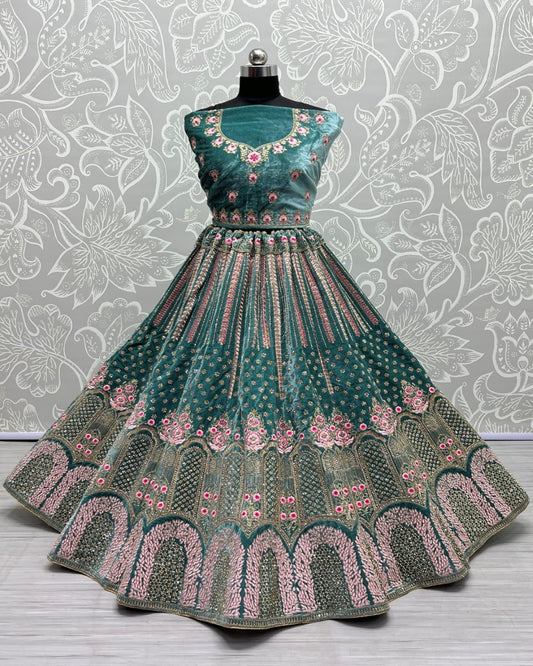 Pastel Color Velvet Embroidered Teal Lehenga choli