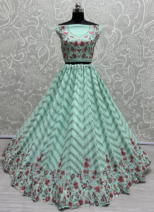 Striking Multi thread and zari work combine with full of zircon diamond perfect partywear Lehengacholi in Aqua