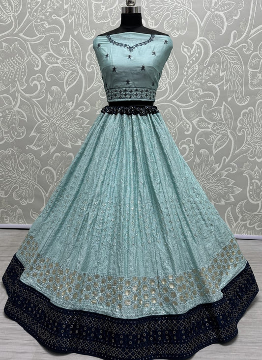 Sequin and cotton thread combine contrast matching partywear Lehengacholi in Aqua Colour