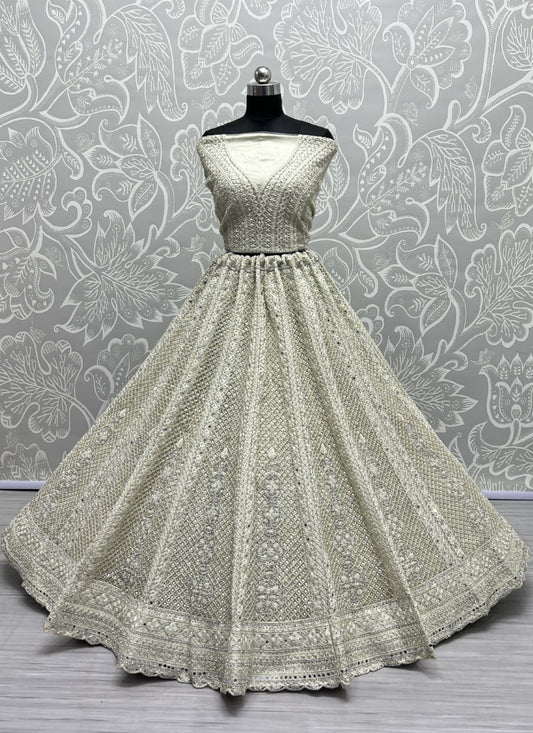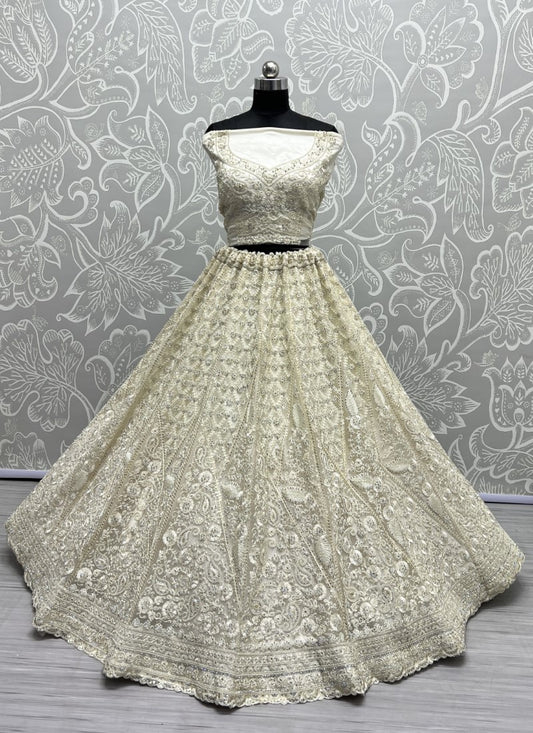 Dori and Zircon Diamond Combine Designer Partywear Beige Lehengacholi
