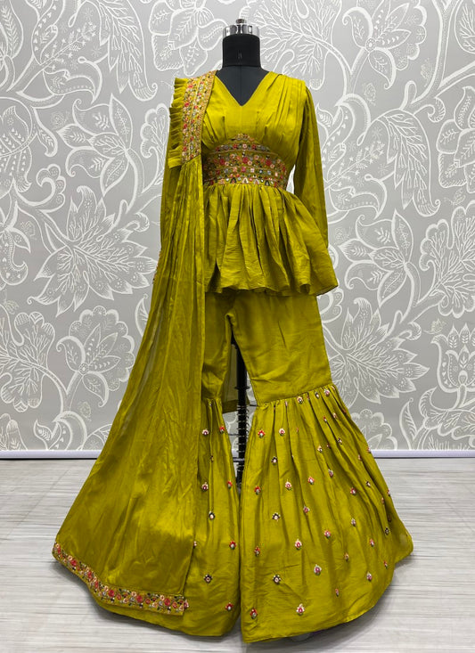 Full stitched pista color designer palazzo suit with platted dupatta