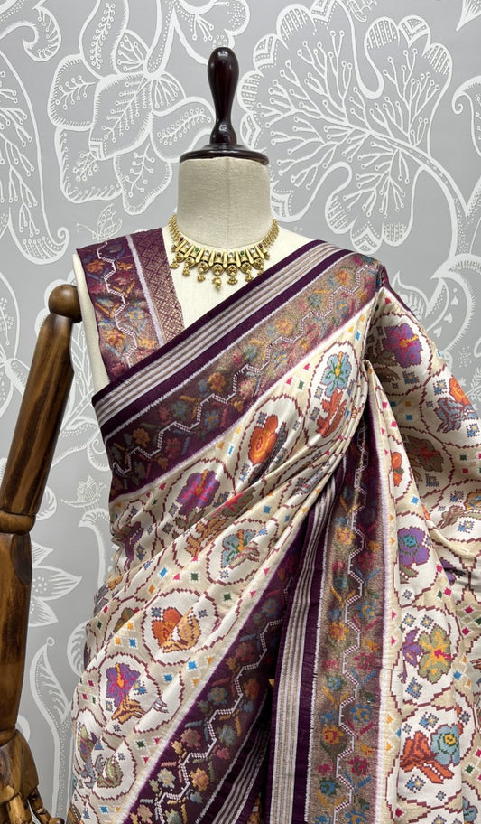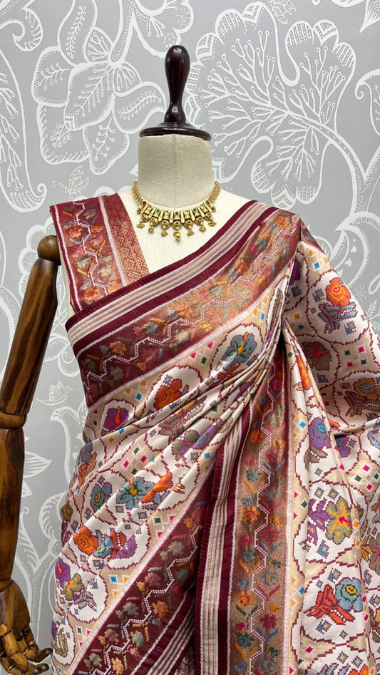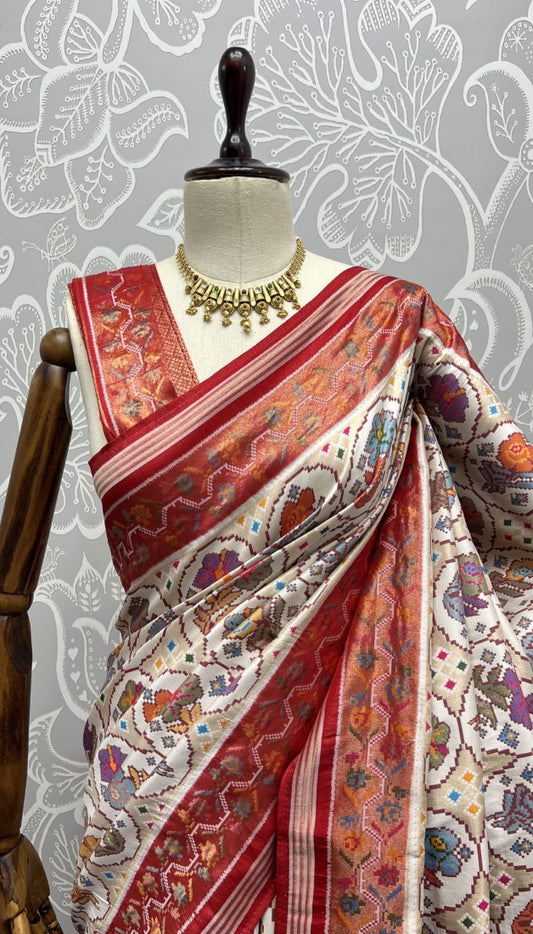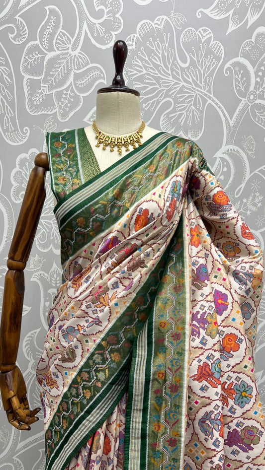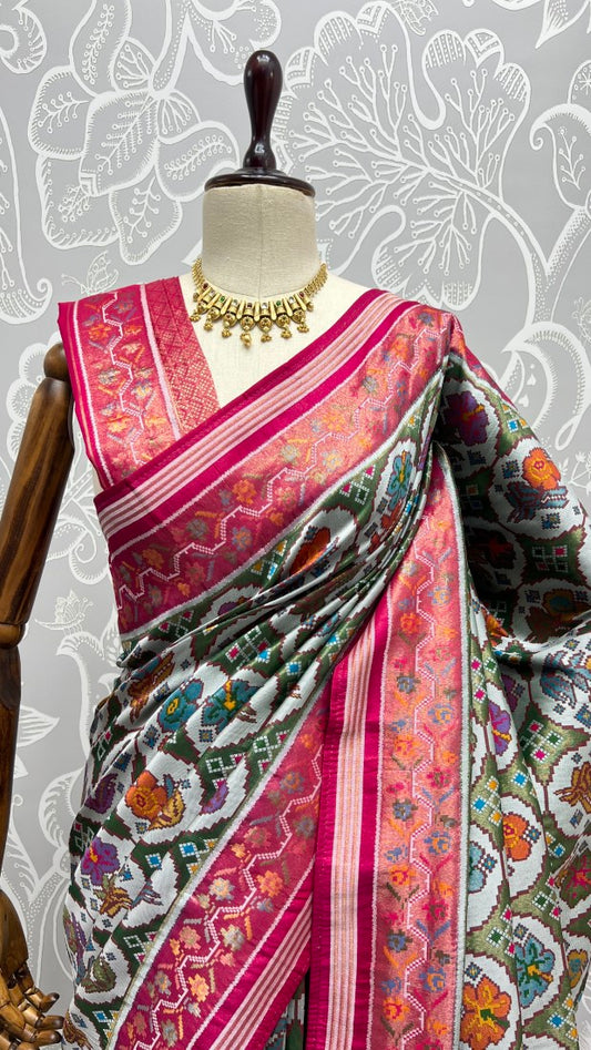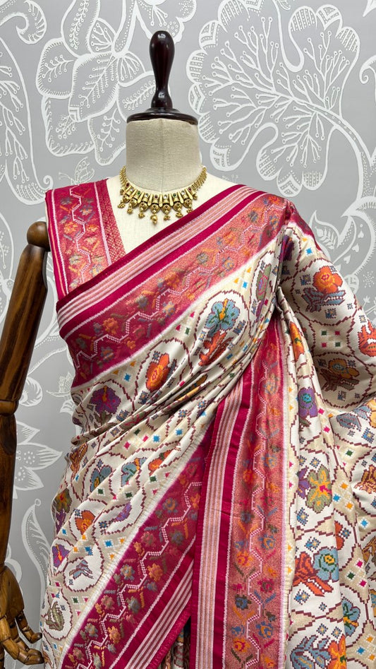 Pure Meena Silk and Dyed Silk Thread Crafted Authentic Patola Saree White