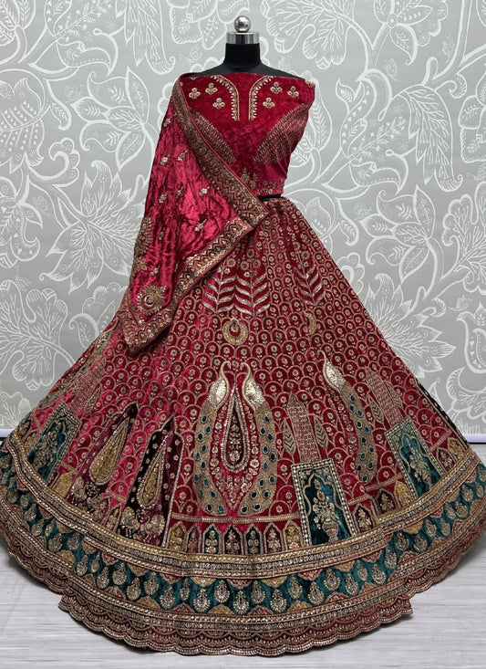 Elegant Peacock Embroidered on velvet with sequins touch up wedding Lehengacholi Pink