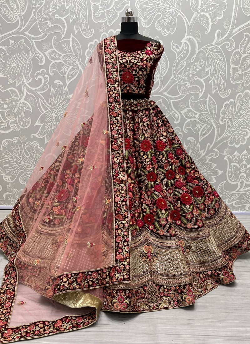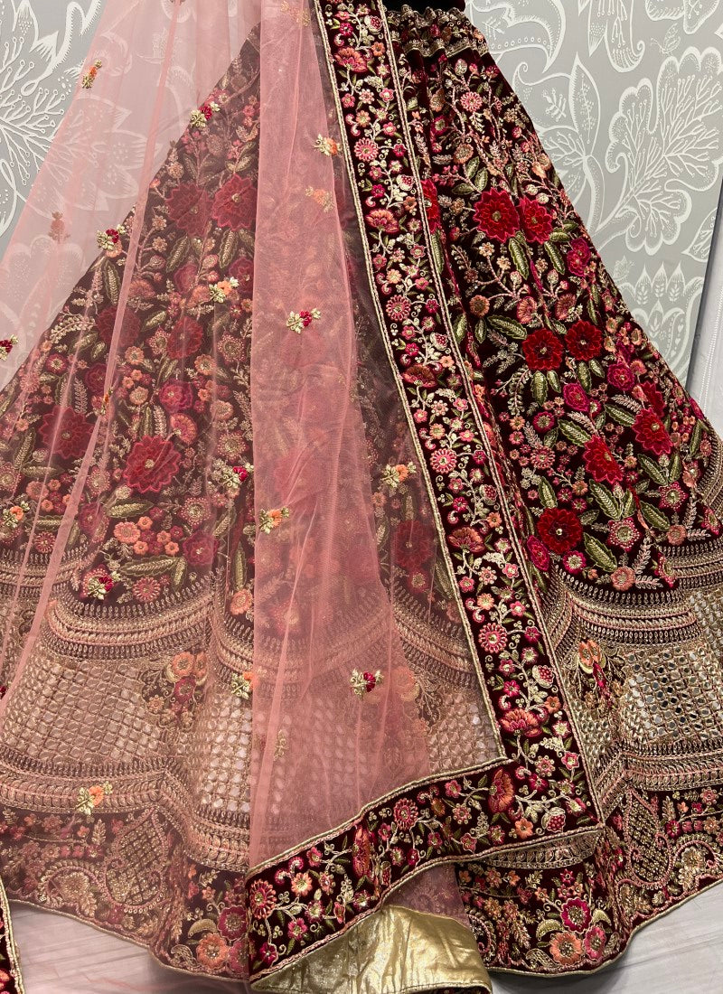 Admirable Art of Work in Maroon Bridal Lehenga - Patch work with handcrafted mirror and many more.