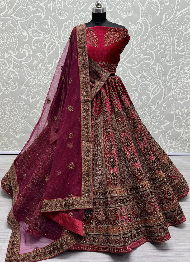 Detail Embroidered with Velvet embroidered patch work Flaired Bridal Lehengacholi in Rani Colour