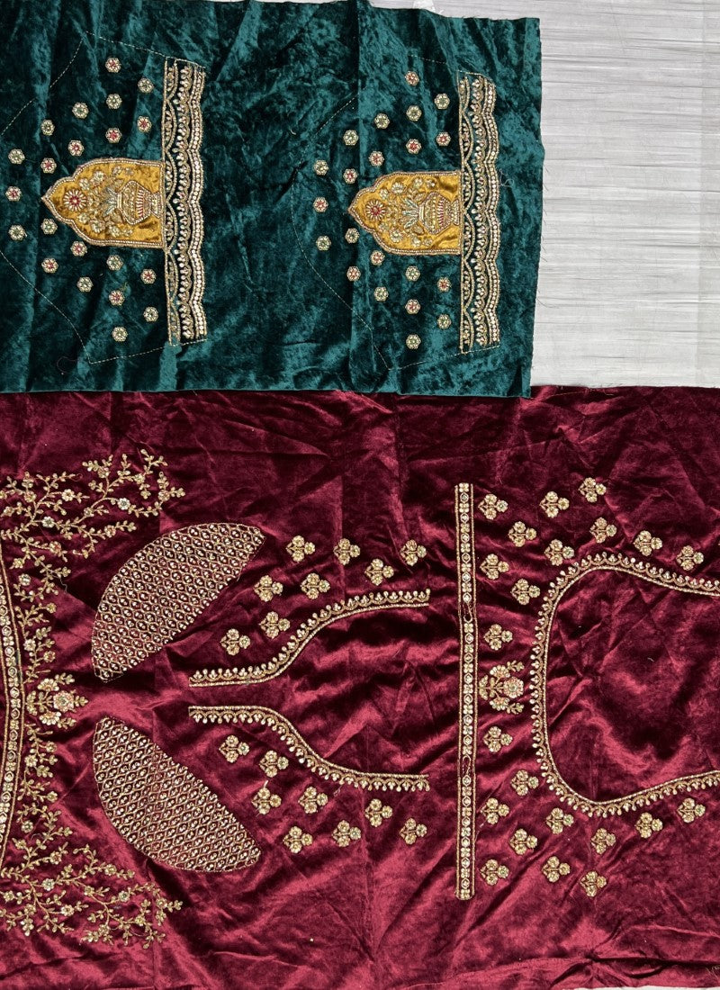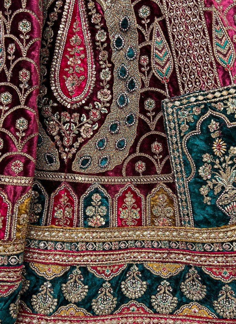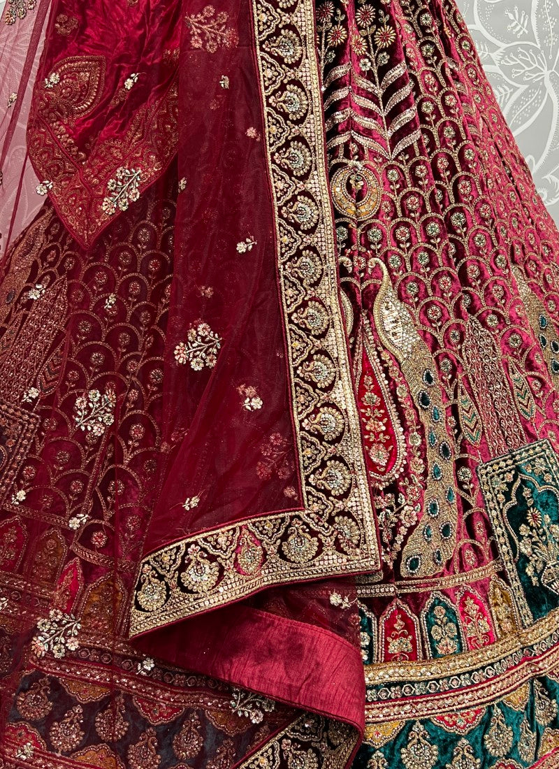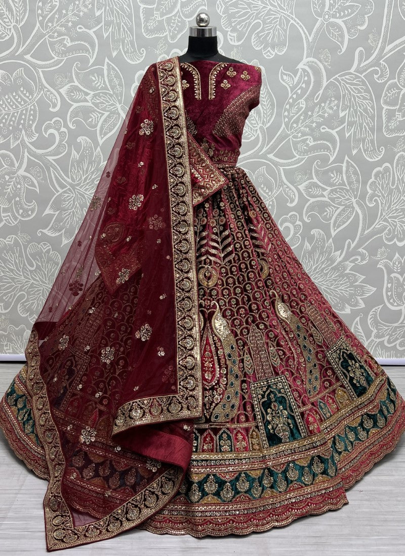 Elegant Peacock Embroidered on velvet with sequins touch up wedding Lehengacholi Marron