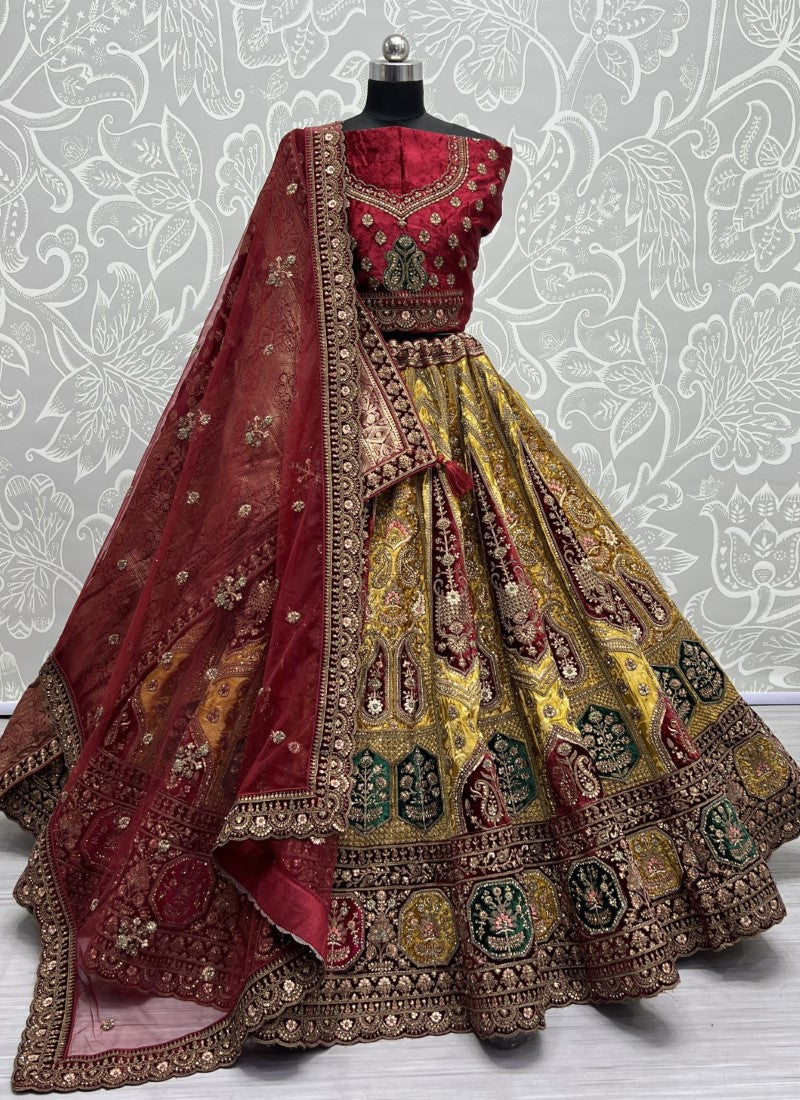 Splendid Banarasi Silk crafted In various color velvet patch work Perfect Reception Lehengacholi Mustard