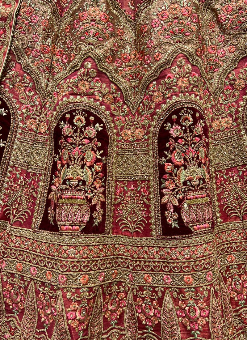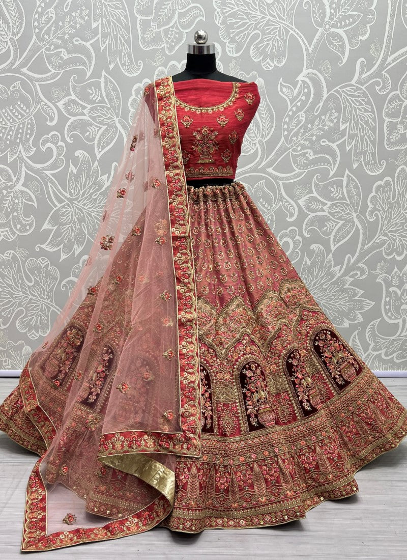 Velvet Patch Work Embroidered Bridal Net Wedding Pink Lehengacholi